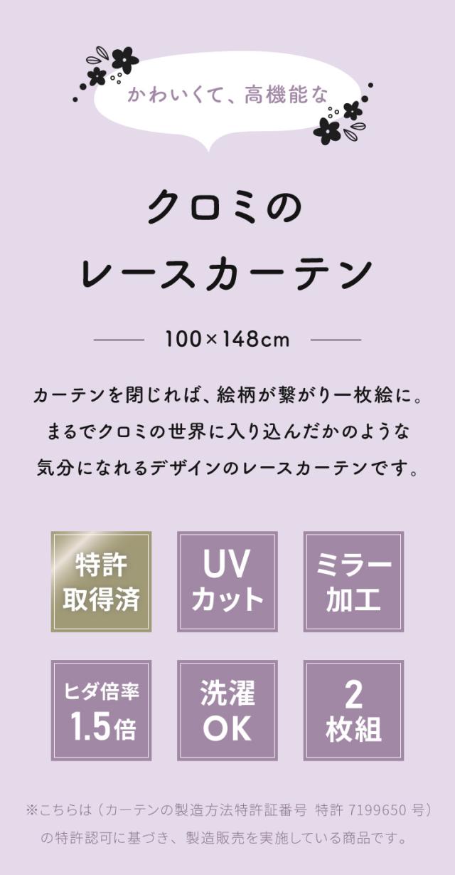 クロミ絵羽レースカーテン 2枚組 100×148cm UVカット 洗える 洗濯 プライバシー 目隠し フック付き カーテン 紫外線 おしゃれ かわいい サンリオ マイメロディ クロミ バク(代引不可)【送料無料