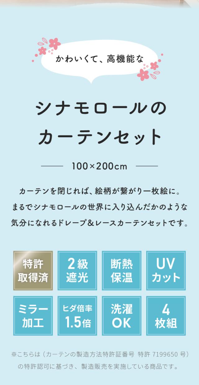 シナモロールの2級遮光カーテンとレースカーテンの4枚セットです。