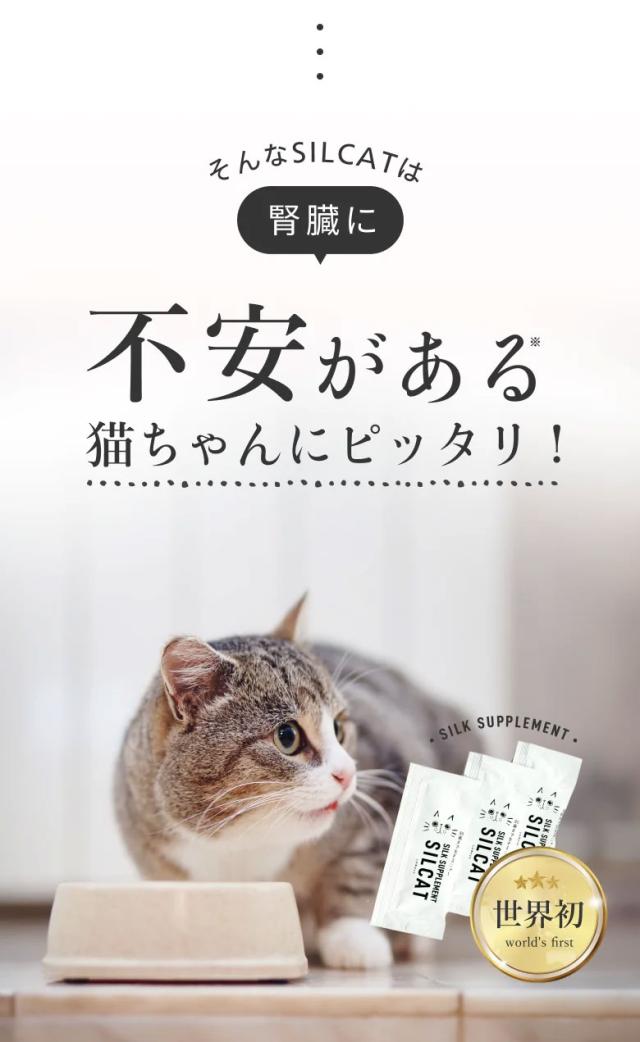 特許技術「高分子量シルクフィブロイン水溶液」を活用した、世界初の猫用の腎臓ケアサプリメントです。