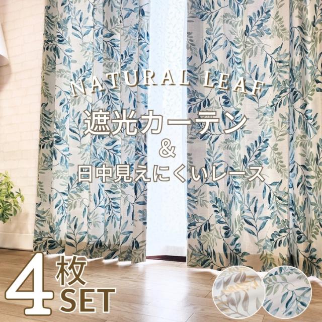 4枚セット 遮光 風通 ナチュラルリーフ 遮光カーテン&日中見えにくいレース 4枚セット 幅100cm 丈135 178 200cm おしゃれ 北欧