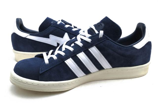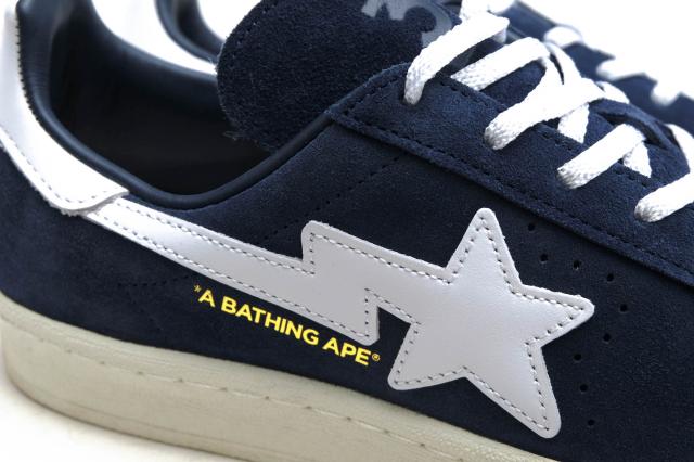 adidas OriginalsとA BATHING APEのコラボレーションによる「CAMPUS 80s BAPE」。1983年から続く「CAMPUS」モデルのクラシックな形状を踏襲しつつ、モダンなストリートファッションスタイルにリアレンジ。スエードレザーを使用したアッパーに、BAPEの代表的な「スタ」モチーフとadidasの伝統的な「スリーストライプス」を左右非対称に配置しています。