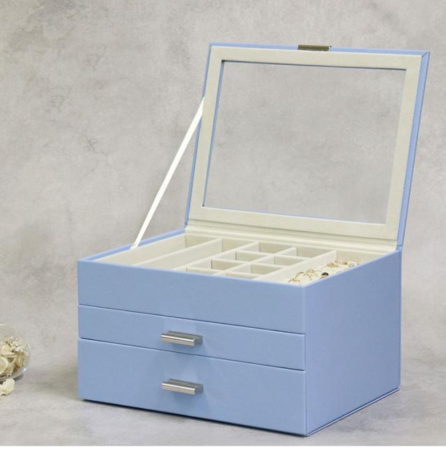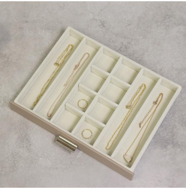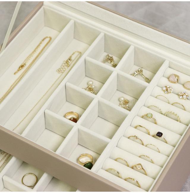 上段収納はさまざまな区分けがされており、リングやネックレスなどの収納に適しております。