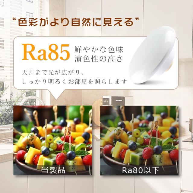 ★色がより自然に見える、肌や食べ物の色がより美しく自然に見えます。住宅の室内照明の場合、Ra85以上が好ましいとされています。