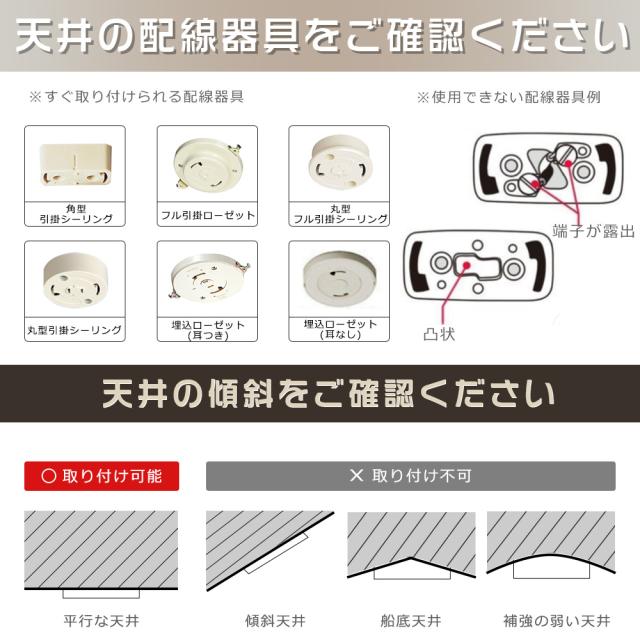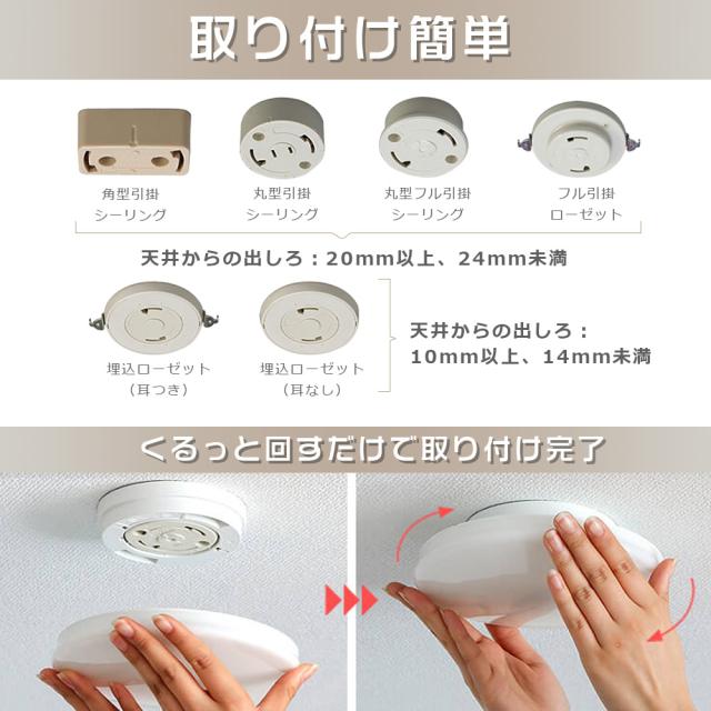 ・天井に引掛けシーリングやローゼットなどの配線器具があれば、付属のアダプターで簡単に取付できます。今お使いの照明器具と取り換えるだけ。工具も工事も不要。くるっと回すだけで取り付け完了。