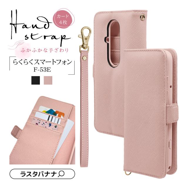 【ポスト投函不可】らくらくスマートフォンF-53E ケース カバー 手帳型 カード入れ おしゃれ スタンド機能 シンプル 大人 レディース メンズ ハンドストラップ付き らくスマ スマホケース ラスタバナナ 8461F53EBHSBK 8462F53EBHSLPK