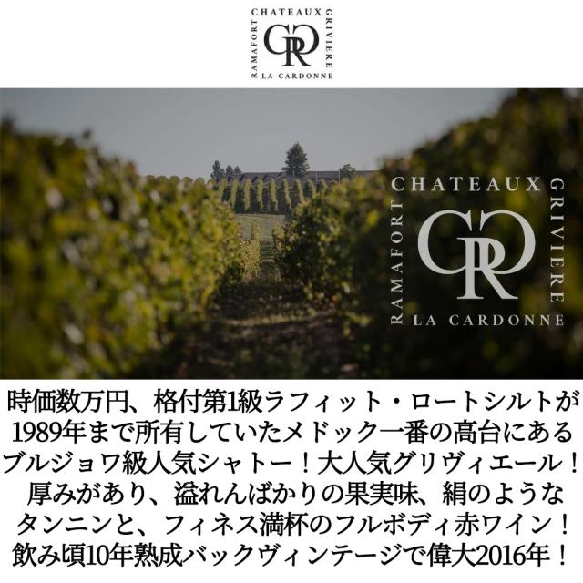 時価数万円、格付第1級ラフィット・ロートシルトが 1989年まで所有していたメドック一番の高台にある ブルジョワ級人気シャトー!大人気グリヴィエール! 厚みがあり、溢れんばかりの果実味、絹のような タンニンと、フィネス満杯のフルボディ赤ワイン! 飲み頃9年熟成バックヴィンテージで偉大2016年!