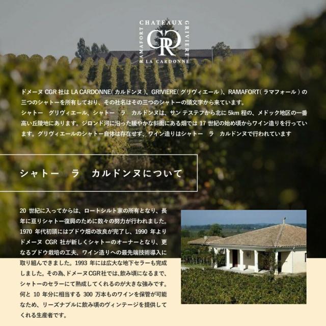 ドメーヌ CGR社はLA CARDONNE(カルドンヌ)、GRIVIERE(グリヴィエール)、AMAFORT (ラマフォール)の三つのシャトーを所有しており、その社名はその三つのシャトーの頭文字から来ています。シャトー・グリヴィエール、 シャトー・ラ・カルドンヌは、サ ン・テステフの北、 メドック地区の一番高い丘陵地にありあります。 ジロンド河に沿った緩やかな斜面にある畑には17世紀の始め頃からワイン造りを行っています。