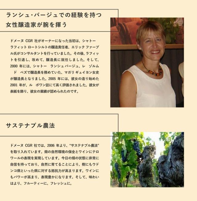 ラフィットのチームから女性醸造家にドメーヌCGR社がオーナーになった当初は、 シャトーラフィット・ロートシルトの前醸造責任者、エリック・ファーブル氏率いる醸造チームが醸造にあたっていました。 その後、2000年から、ランシュ・バージュで醸造を 務めていた、マガリ・ギュイヨン女史がエノロジストとなりました。 2005年には、彼女の造り始めた2001年が、 ル・ポワン (誌)にて高い評価がされ、 彼女が表紙を飾りました。
