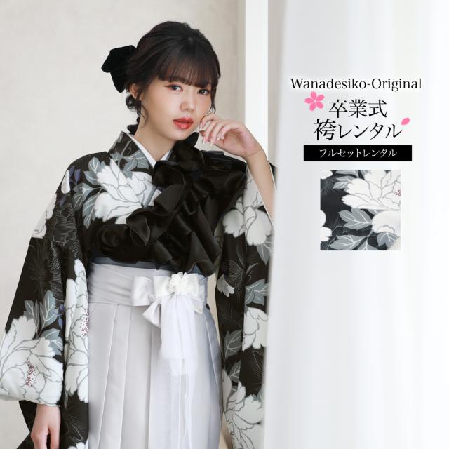 履物が選べるレンタル 卒業式 袴 レンタル 大学生 フルセット 袴セット 卒業式袴セット 2尺袖着物&袴フルセットレンタル シンプル 「黒地に牡丹とグレーライン牡丹」 上品 レディース 女の子 先生 オリジナル ブラック