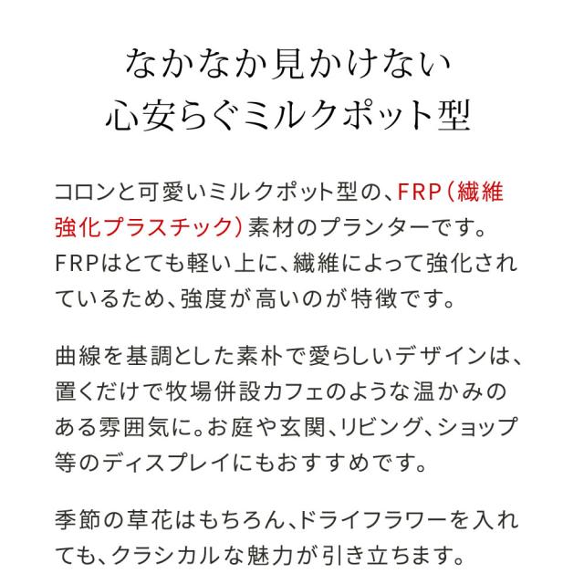 軽量で丈夫、腐らないFRP製(繊維強化プラスチック)ミルクポット型プランターで植物も雑貨もおしゃれに収納。