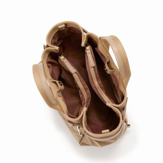 人気のリプル素材と光沢のあるナイロンとのコンビネーションにダブルベルトをあしらい、品よく仕上げたミニトート。