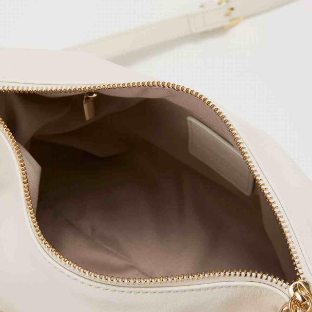 着脱可能なレザーショルダーベルトが付き、ワンショルダーや斜めがけなど装いや気分に合わせてさまざまな持ち方ができます。