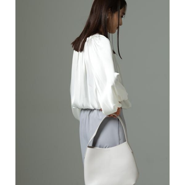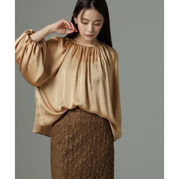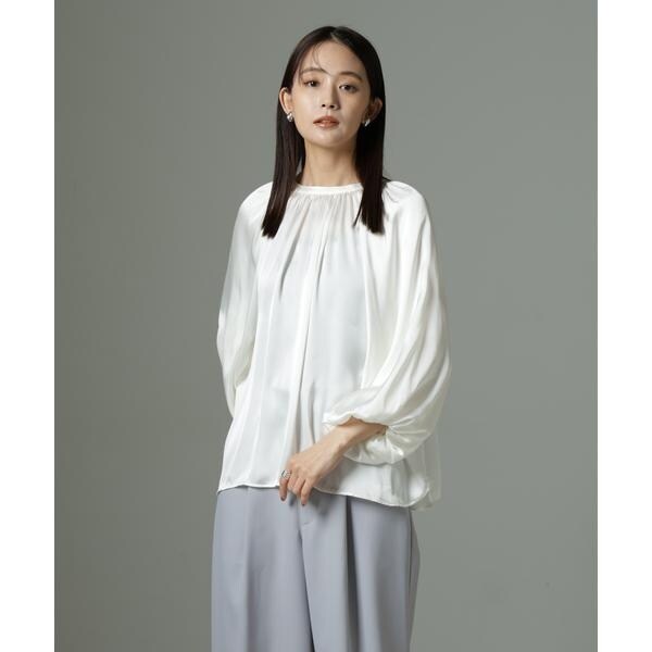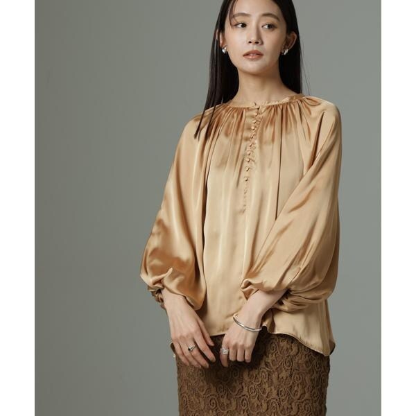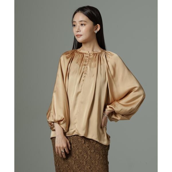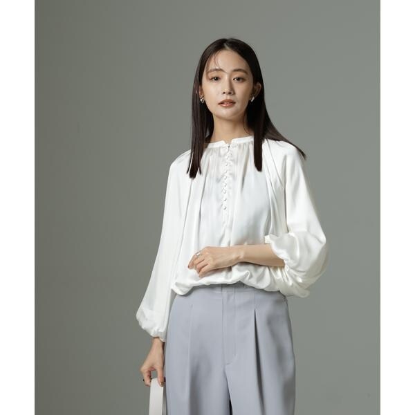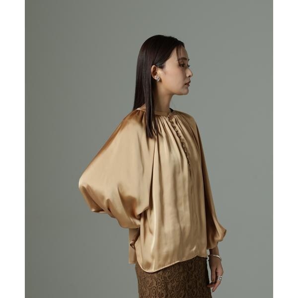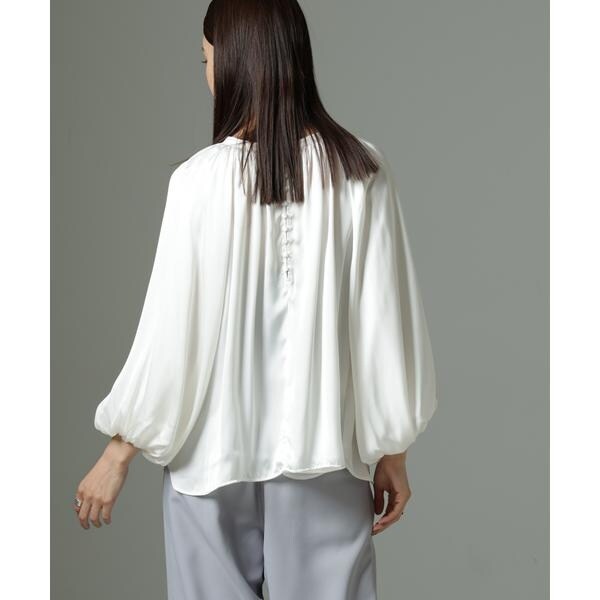 ボリューム感と、サテン素材がエレガントな印象のデザインブラウス。クルミボタンがついたデザインとギャザーが寄ったシンプルなデザインの前後2wayで着用可能なアイテムです。