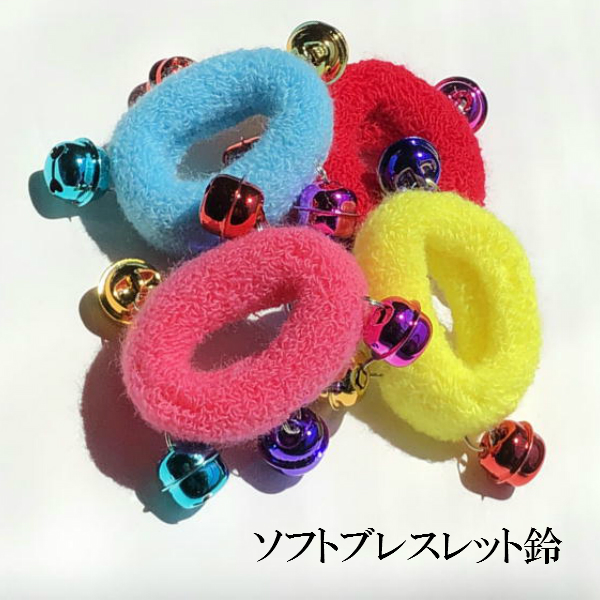 ソフトブレスレット鈴【色】赤、ピンク、水色、黄色【サイズ】鈴 約1.8cm/外径 約5cm/内径 約2cm【素材】鈴 ブリキ/ゴム パイル