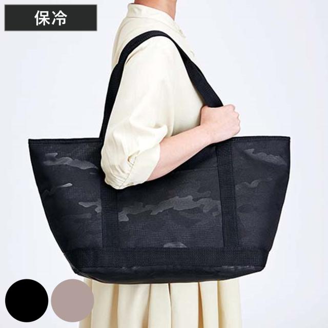 バッグの内側は保冷効果のある素材のため、食品や飲み物などの品質を保って持ち運びできます。また、保冷効果の高いファスナー開閉式。中身が見えずに持ち運ぶことができ、自転車のカゴなどに入れても中の荷物が飛び出す心配もありません。