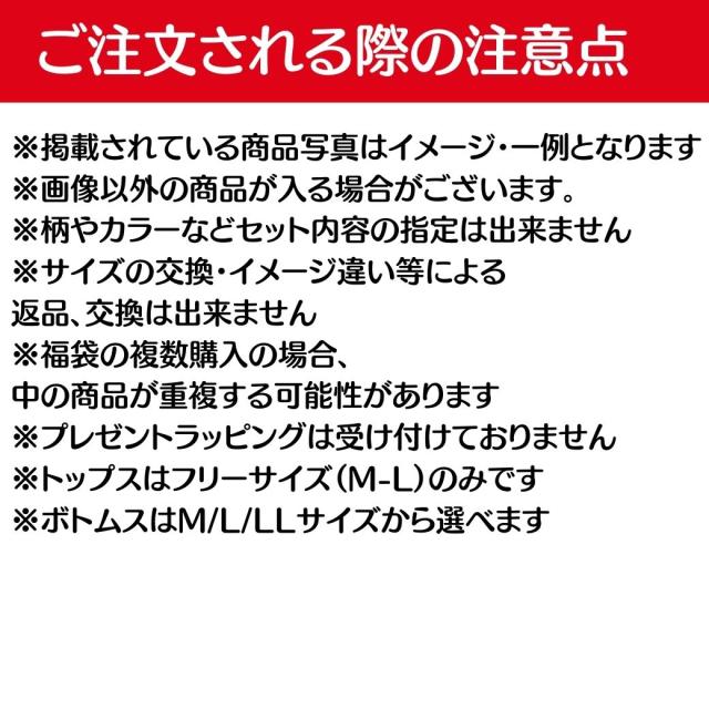 シーズン】秋・冬生産国】日本・中国etcカラー】ブラック・グレー・ブラウン・ベージュ・カーキグリーン・ブルー・ネイビートップスサイズ】フリーサイズ(M-L)ズボンサイズ】 M/L/LL裾の長さ(丈)】 10分丈・7分丈・クロップド洗濯表示】 家庭洗濯素材(生地・毛糸)】 ポリエステル・綿・コットン・レーヨンetc機能性(生地・布)】 ストレッチ福袋の特徴 トップスボトムス合計2点以上入る福袋をお作りします。総額8,000円以上の商品をお入れするので、大変お得な福袋となっています。