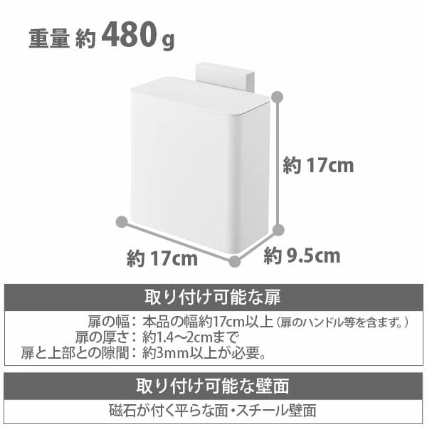| 対応サイズ | 【取り付け可能な扉】 扉の幅:本品の幅約17cm以上(扉のハンドル等を含まず。) 扉の厚さ:約1.4〜2cmまで 扉と上部との隙間:約3mm以上が必要。 【取り付け可能な壁面】 磁石が付く平らな面・スチール壁面 |