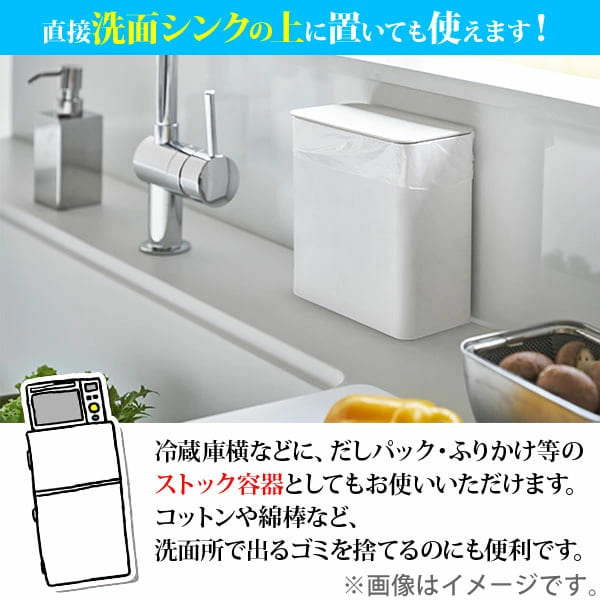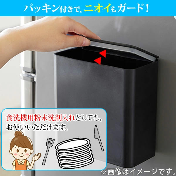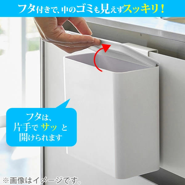シンク扉や冷蔵庫横などに、簡単に取り付けられる蓋付きゴミ箱です。