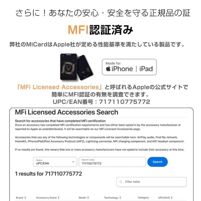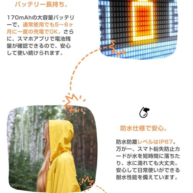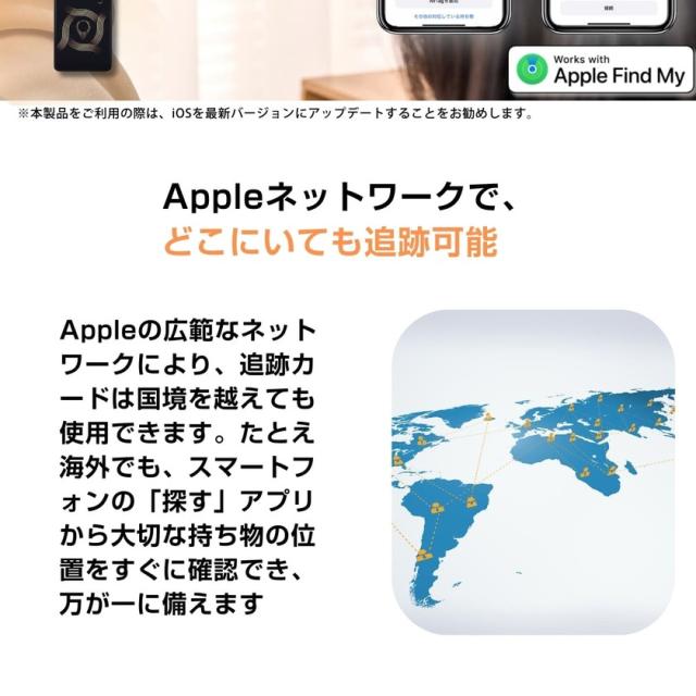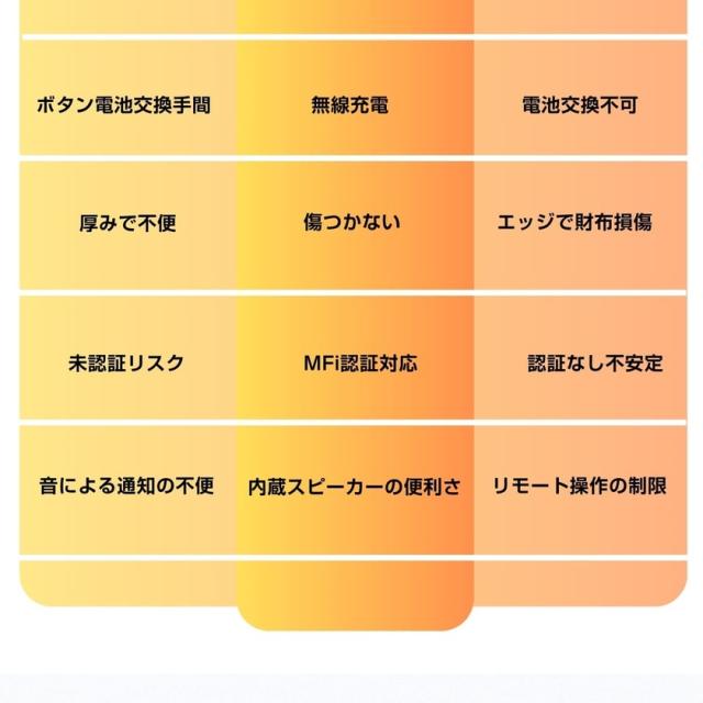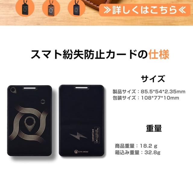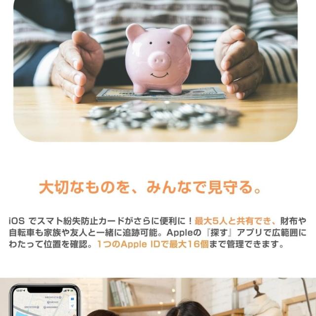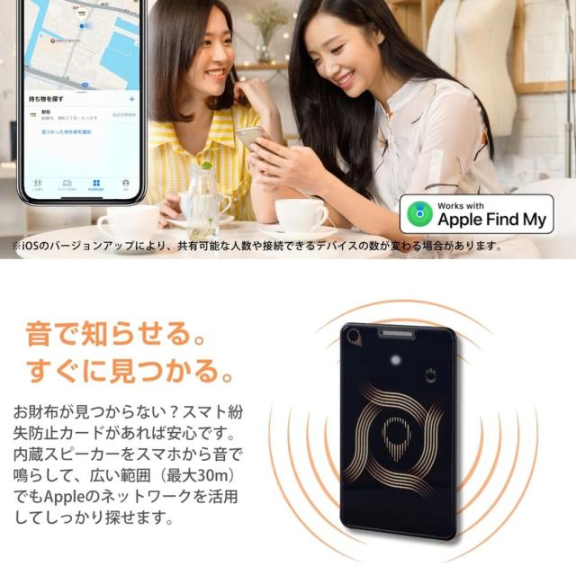 | 商品仕様 | 無線距離:30m アラーム音量:60〜80dB 対応アプリ:探す(Apple Find My app) 防水規格:IP67 応用システム:推薦iOS18以後 本体サイズ:85.5×54×2.35mm 本体質量:18.2g |