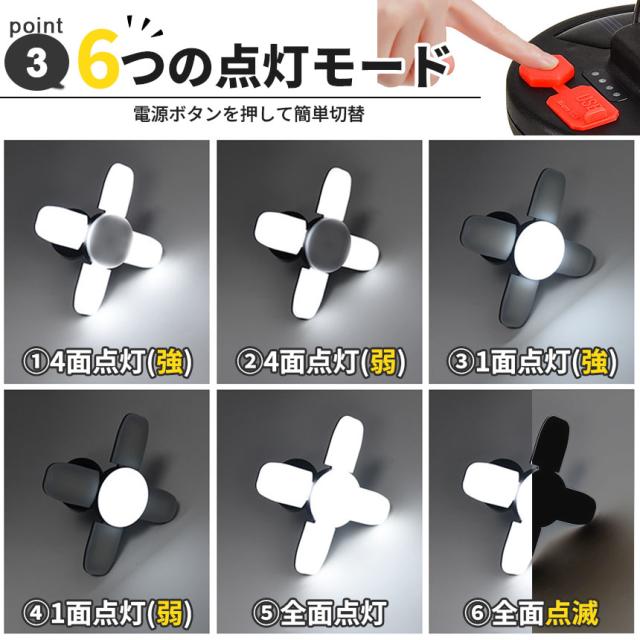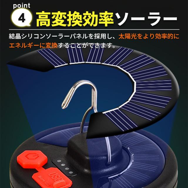 高輝度・ソーラー充電・防水・フックつきなど、屋外での使用にぴったりな機能が備わっています。