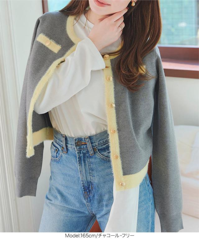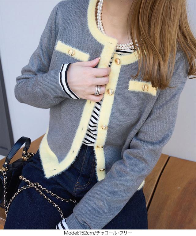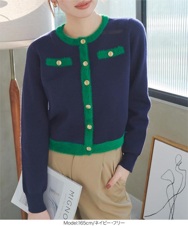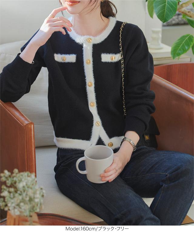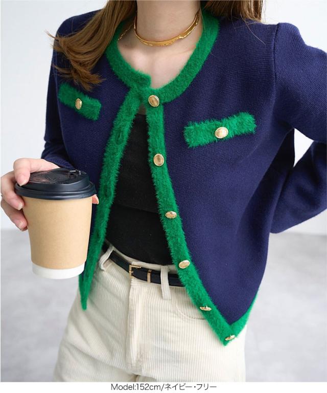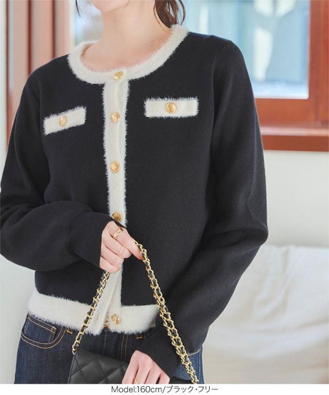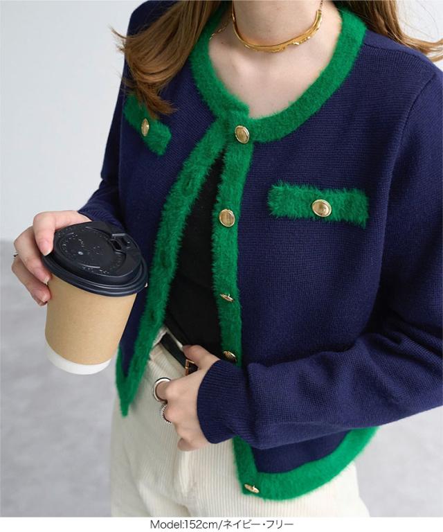 パイピングシャギーニットジャケットカーディガン C7379 入荷済 レディース 20代 30代 40代 バイカラー ノーカラージャケット ニット セーター カーディガン ジャケット ゴールドボタン 羽織り オフィスカジュアル