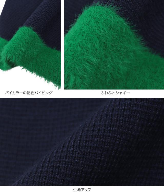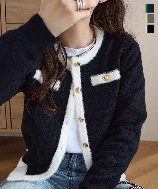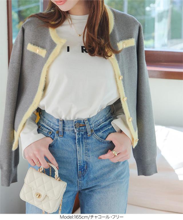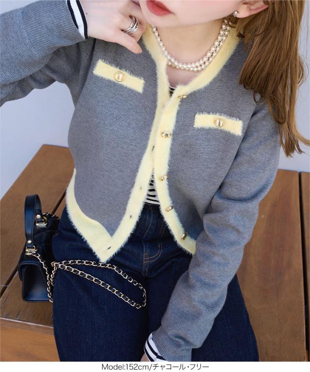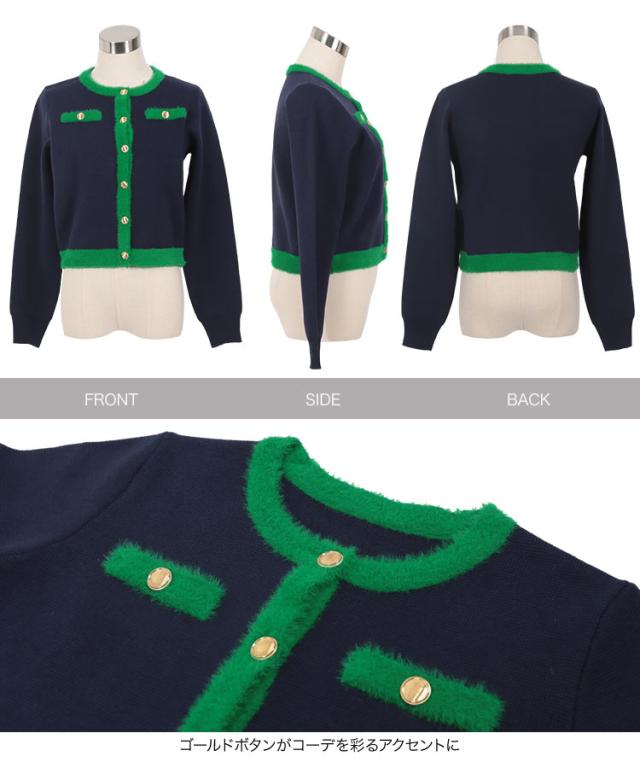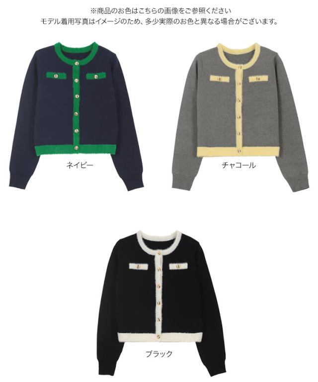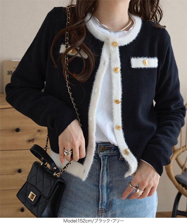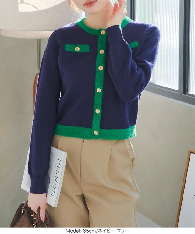パイピングシャギーニットジャケットカーディガン C7379 入荷済 レディース 20代 30代 40代 バイカラー ノーカラージャケット ニット セーター カーディガン ジャケット ゴールドボタン 羽織り オフィスカジュアル