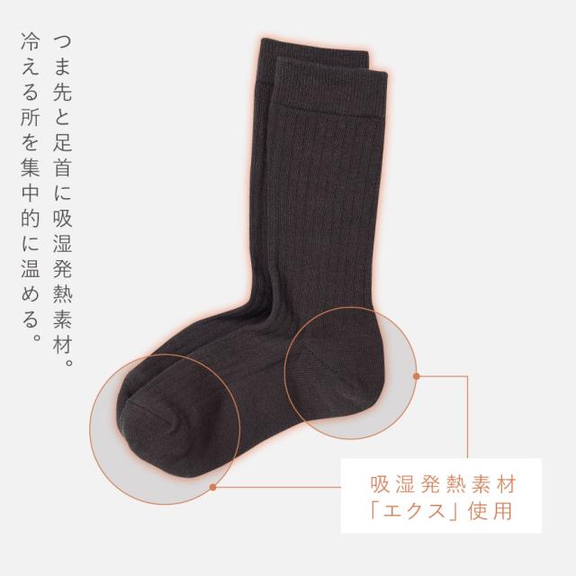 冷えやすいつま先・かかとに吸湿発熱素材『エクス』を使用したあったかメンズソックス。全体は足にフィットするテーパー編みを採用。また、L型ヒールでかかとによりフィットし、快適な履き心地。