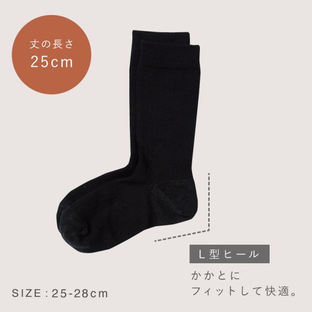 長い丈がふくらはぎ全体を覆い、寒い季節には足全体を保温して冷え対策にも最適。膝下丈は、スーツにも合わせやすく、座った時にズボンの裾から肌が見えにくいため、ビジネスソックスとしても◎。