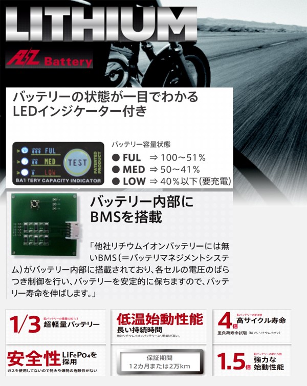 ☆鉛バッテリーの約1.5倍の強力な始動性能!