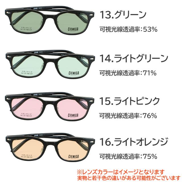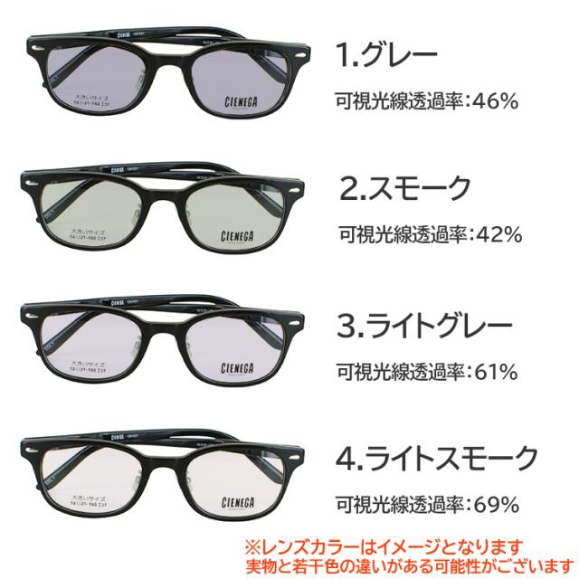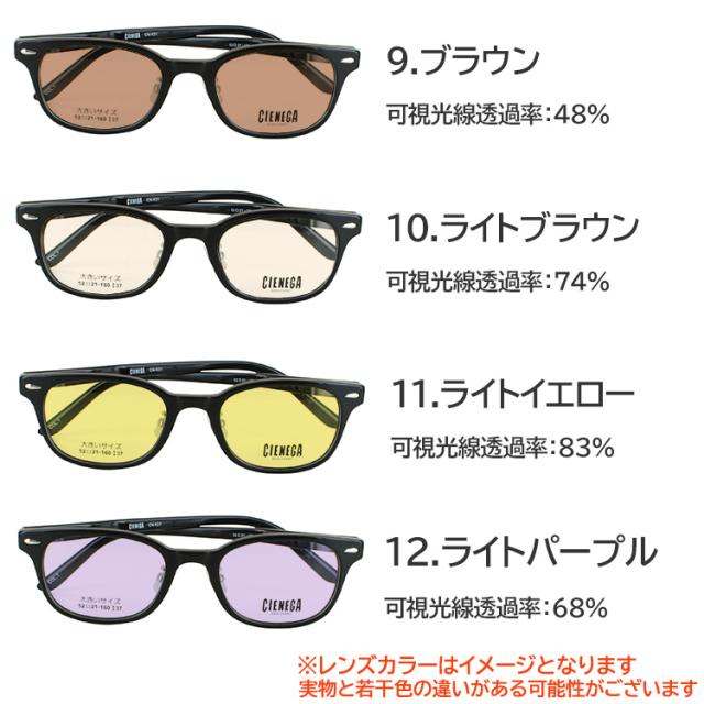 | 商品詳細 ビッグサイズ 大きいサイズ メガネ フレームに、 当店オリジナルカラーレンズを組み合わせた、サングラスです。 顔の大きい人向けのビッグサイズ・大きいサイズのメガネです。 Point1 トレンドのおしゃれなデザイン ゆったりしているのに違和感のない大きさです。 Point2 帽子のサイズ2L以上に相当、テンプルが顔を締め付けるストレス軽減。 一般的なテンプルより15mm長く、最も頭部幅のある部分を湾曲設計することで、締め付け感を軽減しながら、耳掛かりも良く、安定感のある掛け心地を実現しました。 Point3 すき間が目立たない形状で、すっきりスマート 一般的な大きめサイズフレームで気になる、メガネの内側の余分な空間を減らし、掛けた印象をすっきりスマートに見えるように設計しています。 こちらのカラーレンズはUV400nmを約99%カット、 SPF50+ PA+++に対応した高性能カラーレンズとなります ブルーライトも約40%カット レンズカラーは16色の中からお選びいただけます。 <レンズカラー:可視光線透過率 > 1.グレー:46% 2.スモーク:42% 3.ライトグレー:61% 4.ライトスモーク:69% 5.ブルー:44% 6.ブルースモーク:50% 7.ライトブルー:61% 8.クリアブルー:78% 9.ブラウン:48% 10.ライトブラウン:74% 11.ライトイエロー:83% 12.ライトパープル:68% 13.グリーン:53% 14.ライトグリーン:71% 15.ライトピンク:76% 16.ライトオレンジ:75% <ブランド> CIENEGA シェネガ <フレームカラー> CN-K31-1 ブラック CN-K31-2 ブラウンデミ <サイズ情報> CN-K31 フレームサイズ(約) 横145mm×縦41mm レンズサイズ(約) 横52mm×縦37mm 鼻幅(約)21mm、テンプルの長さ(約)160mm <素材> フレーム材質: アセテート テンプル材質:アセテート 付属品:ケース 重量: 約28g(デモレンズ含む) |