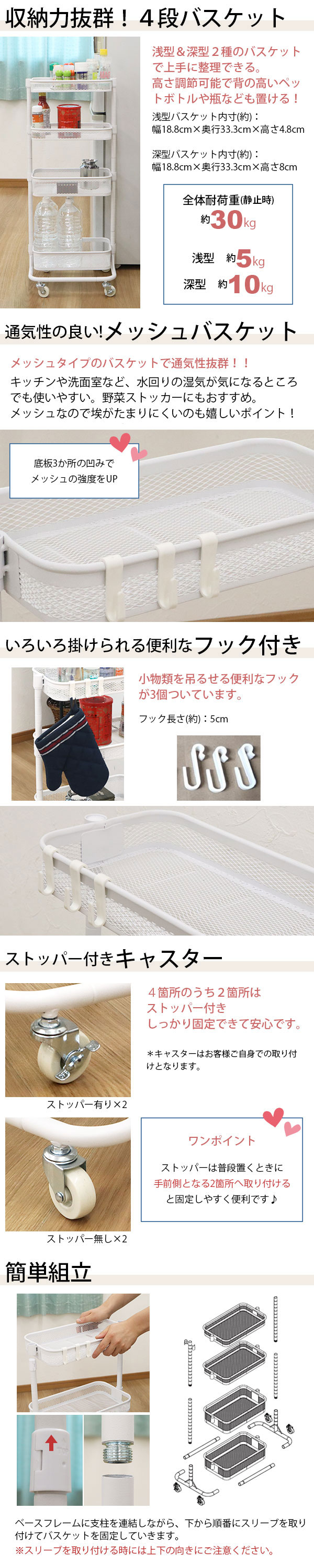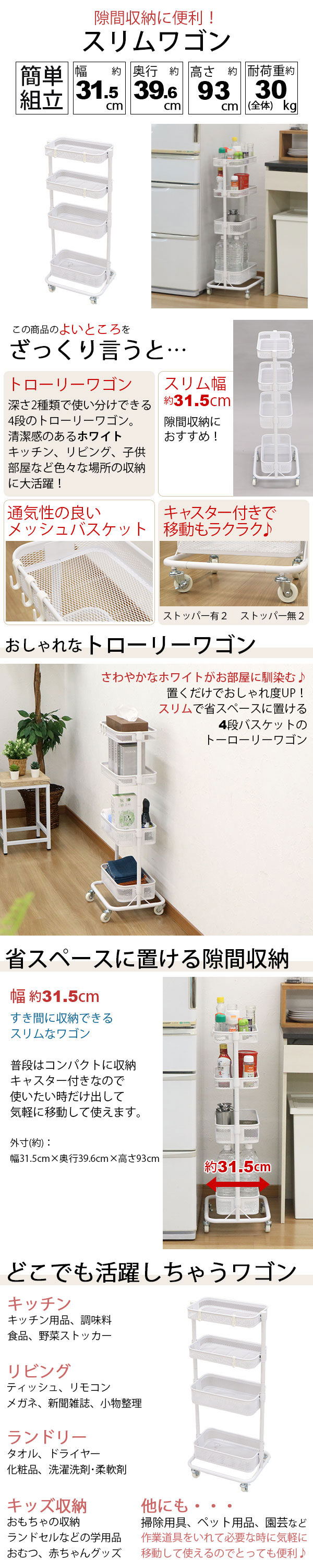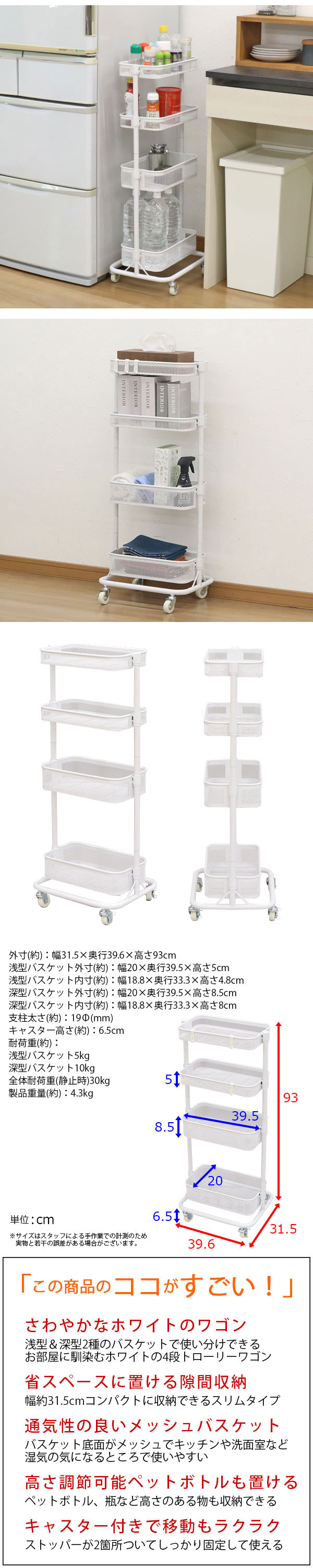 すきま ワゴン 4段 30幅 キッチンワゴン キャスター付き メッシュ底 スリム 隙間収納 おしゃれ メッシュ ワゴン ホワイト メッシュ 白 スチール 頑丈 かごの高さが変えられる すき間ワゴン 洗面所 洗濯機横 収納 サイドワゴン バスケットワゴン (約)幅32cm 奥行40cm 高さ93cm 家具 インテリア 収納家具 収納 棚 フック付き 四段ワゴン 収納ワゴン すきま収納 すき間収納 隙間ワゴン すきまワゴン スチールワゴン キャスターワゴン スリムワゴン バスケットトローリー トローリーワゴン 整理棚 キッチン収納棚 キッチンストッカー 調味料ラック スパイスラック ペットボトル 食料品 ストック 収納 ランドリーワゴン 洗剤 ストック タオル収納 メイク道具 コスメ 化粧品 ベビーワゴン 赤ちゃん ワゴン おむつ収納 小物収納 おもちゃ 雑貨 ぬいぐるみ フラワースタンド 花台 プランターラック コンパクト 省スペース 丈夫 高さ調節 新生活 一人暮らし ワンルーム キッチン 台所 リビング ダイニング 玄関 洗面所 脱衣所 子供部屋 オフィス 店舗 サロン 仕事場 美容室 デスクサイド デスク横 ベッドサイド ベッド横 シンプル モダン かわいい 北欧風 すっきり 片付け 整理整頓 お手入れ簡単 通気性 湿気がこもりにくい 移動しやすい 360度回転キャスター