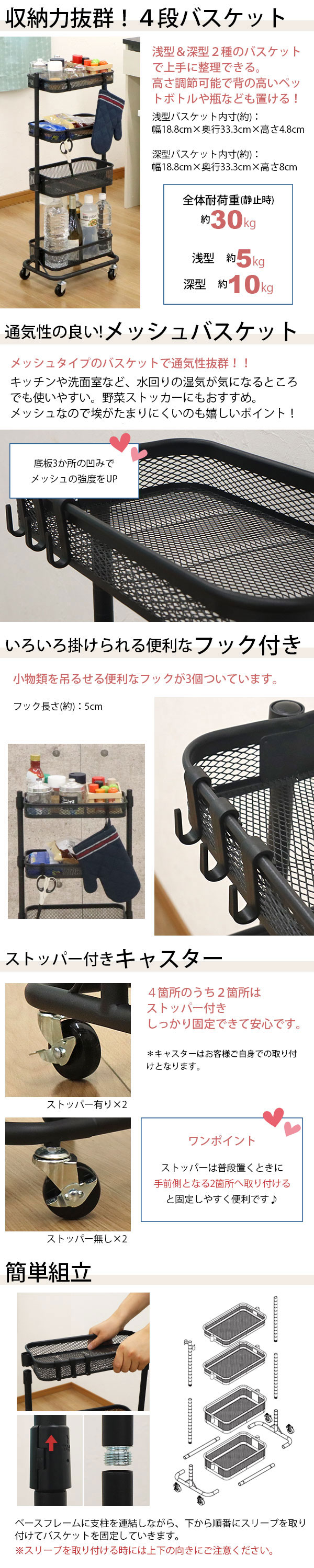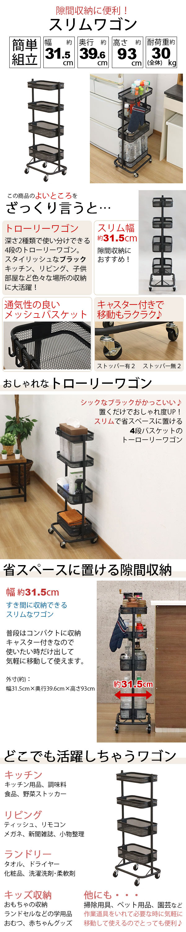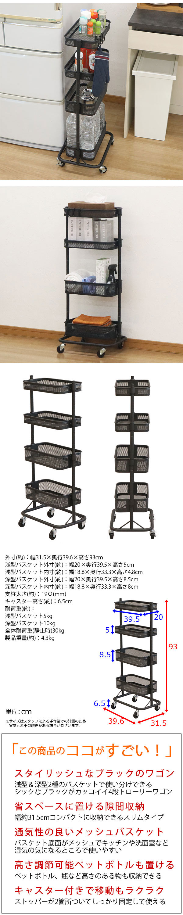 すきま ワゴン 4段 30幅 キッチンワゴン キャスター付き メッシュ底 スリム 隙間収納 おしゃれ メッシュ ワゴン ブラック メッシュ 黒 スチール 頑丈 かごの高さが変えられる すき間ワゴン 洗面所 洗濯機横 収納 サイドワゴン バスケットワゴン (約)幅32cm 奥行40cm 高さ93cm 家具 インテリア 収納家具 収納 棚 フック付き 四段ワゴン 収納ワゴン すきま収納 すき間収納 隙間ワゴン すきまワゴン スチールワゴン キャスターワゴン スリムワゴン バスケットトローリー トローリーワゴン 整理棚 キッチン収納棚 キッチンストッカー 調味料ラック スパイスラック ペットボトル 食料品 ストック 収納 ランドリーワゴン 洗剤 ストック タオル収納 メイク道具 コスメ 化粧品 ベビーワゴン 赤ちゃん ワゴン おむつ収納 小物収納 おもちゃ 雑貨 ぬいぐるみ フラワースタンド 花台 プランターラック コンパクト 省スペース 丈夫 高さ調節 新生活 一人暮らし ワンルーム キッチン 台所 リビング ダイニング 玄関 洗面所 脱衣所 子供部屋 オフィス 店舗 サロン 仕事場 美容室 デスクサイド デスク横 ベッドサイド ベッド横 シンプル モダン かわいい 北欧風 すっきり 片付け 整理整頓 お手入れ簡単 通気性 湿気がこもりにくい 移動しやすい 360度回転キャスター
