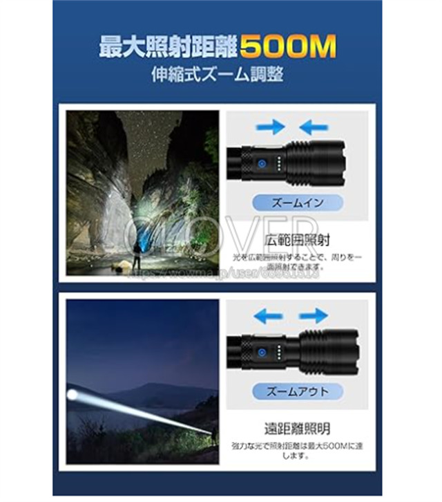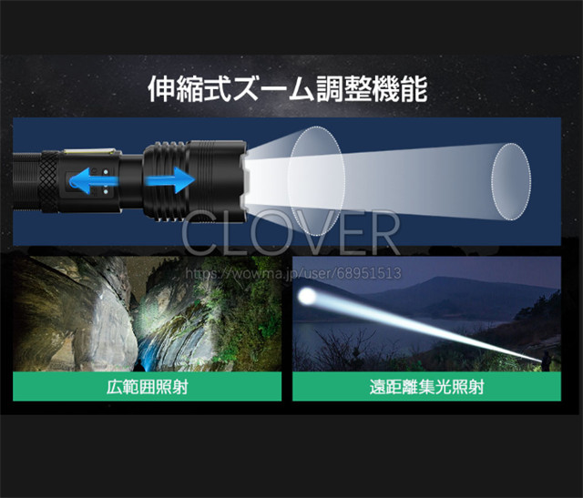 ライトのヘッド部分を伸縮するだけで照射範囲を調整できます。最広範囲にすると目の前はまるで昼間のように明るく、最遠距離にすると500Mまで照射でき、実用性抜群!