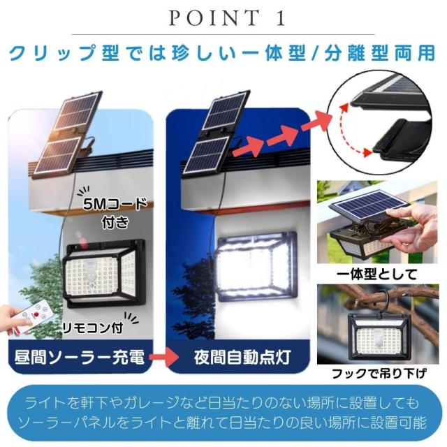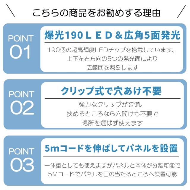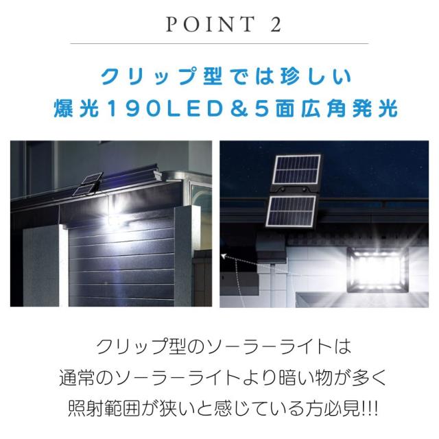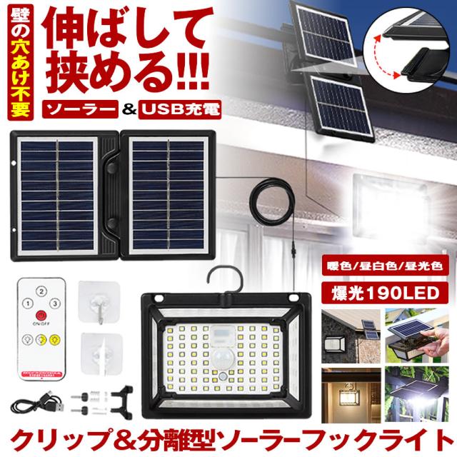 ソーラーライト センサーライト クリップ 屋外 防水 分離型 暖色 昼白光 電球色 明るい 190LED 穴あけ ない ガーデンライト USB充電 クリップライト 人感センサーライト ソーラーセンサーライト LEDライト 人感センサー 防犯 ライト 防災 クリップ式 LED