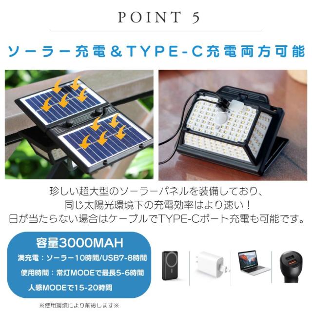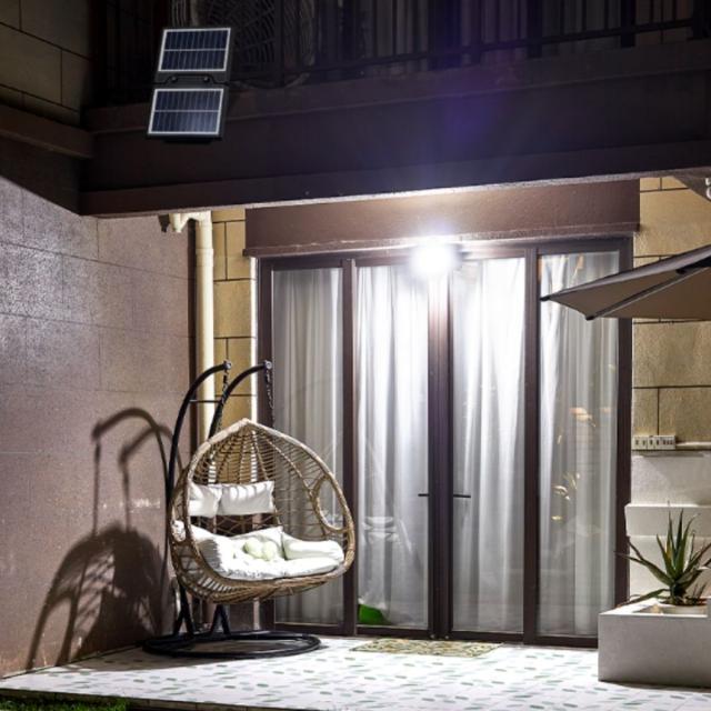本製品は、一体型としてライトとソーラーパネルを一緒に使用するだけでなく、分離型としても使用可能です。分離型の場合、付属の5m延長ケーブルを使用してソーラーパネルを日当たりの良い場所に設置し、ライト本体を必要な場所に配置することができます。この柔軟性により、ソーラーパネルが日陰になる場合でも充電が可能です。