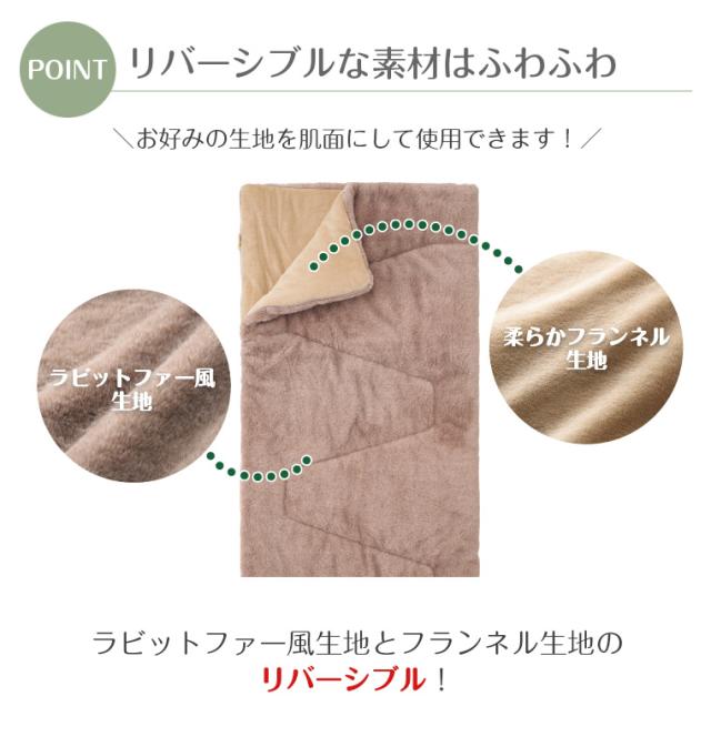 【特徴】表面にはラビット風のずっと触っていたくなるふわふわ生地を、裏面にはやわらかくてあたたかなフランネル生地を使用した、とにかく気持ちいいラビットファータッチシュラフ。