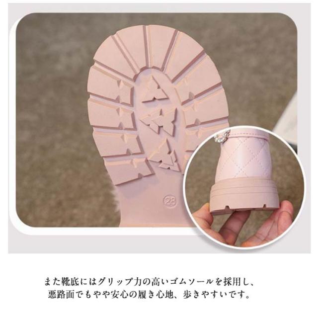 | 履き口のフェイクファーが可愛いムートンブーツ。 履き口周りとブーツ内側全面に、肌触りのよいふわふわなフェイクファーを使用。 お子さまの足をつま先まで暖かく包み込み、寒い季節もほっこり優しい履き心地です。 また靴底にはグリップ力の高いゴムソールを採用し、悪路面でもやや安心の履き心地、歩きやすいです。 秋冬のコーディネートに活躍すること間違いなしの1足です。 | |