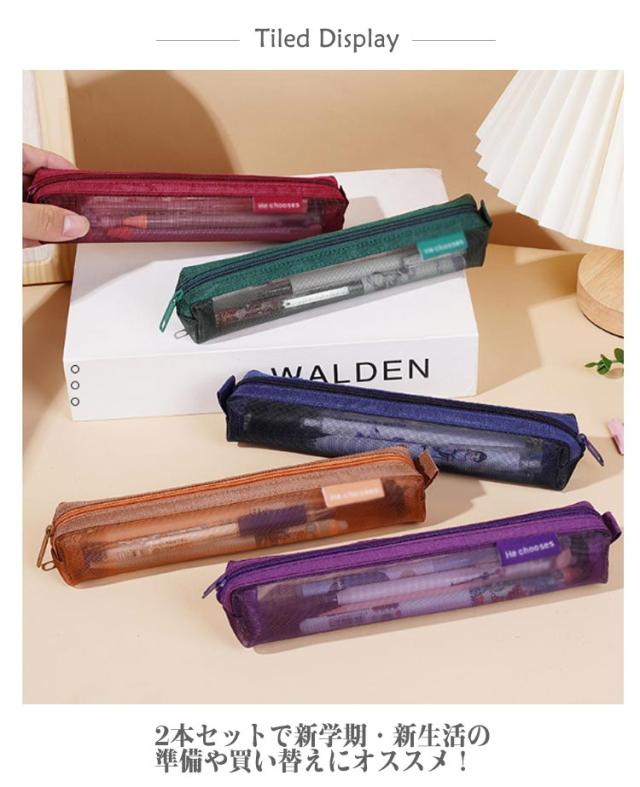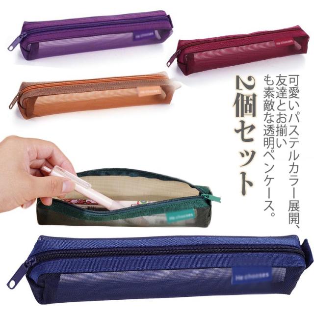 おしゃれ クリア 【2個セット】メッシュ シンプル 【2個セット】メッシュ ペンポーチ 透明 筆箱 薄型 鉛筆入れ ペンポーチ 中身確認 入学祝い
