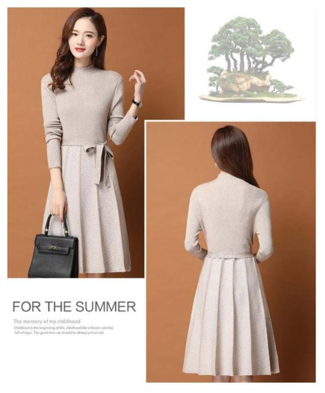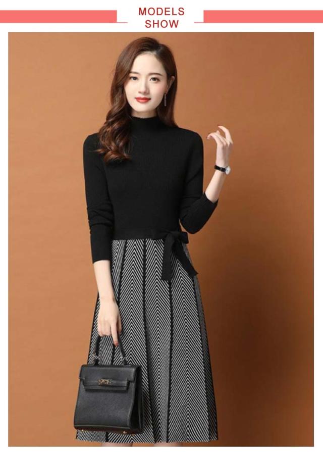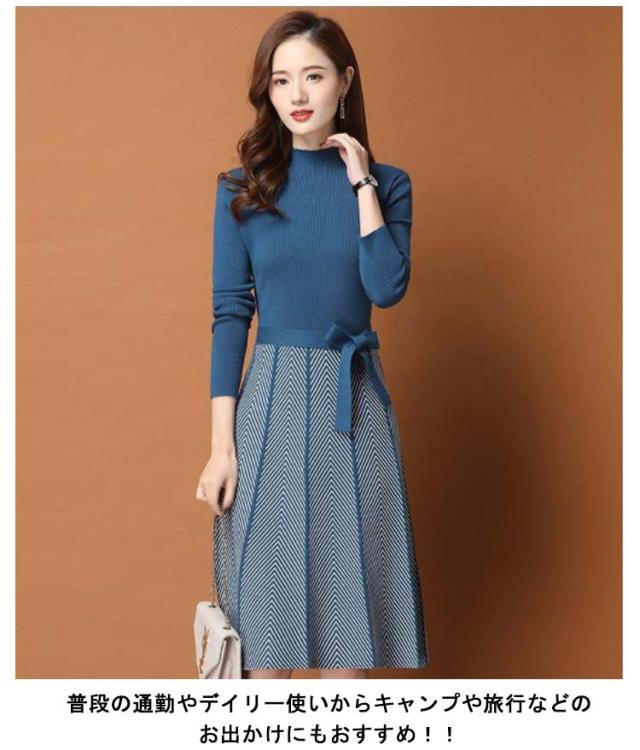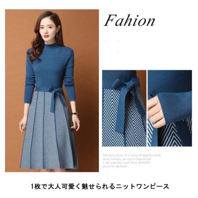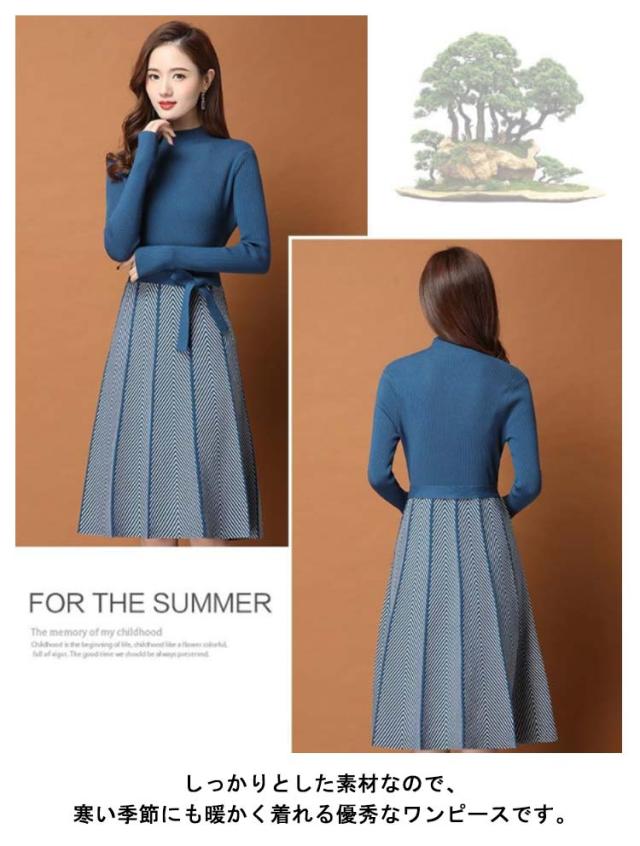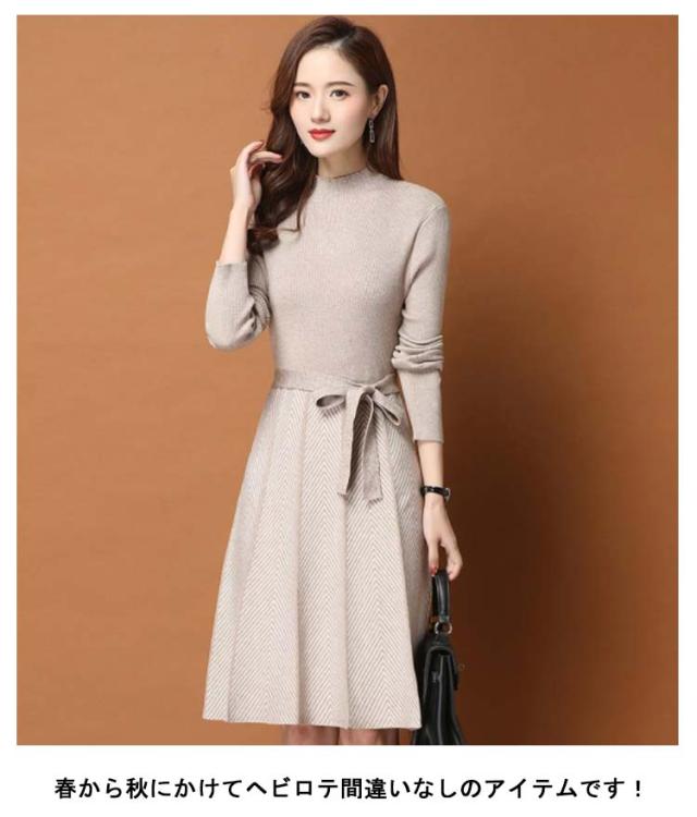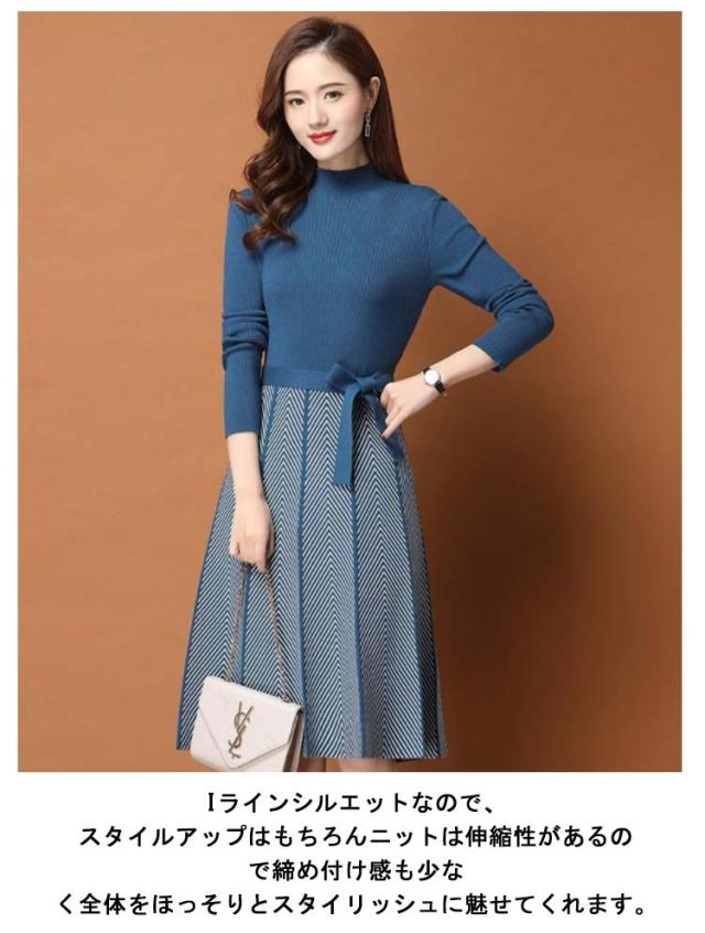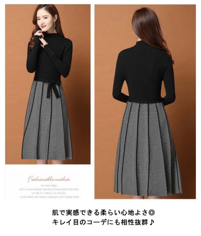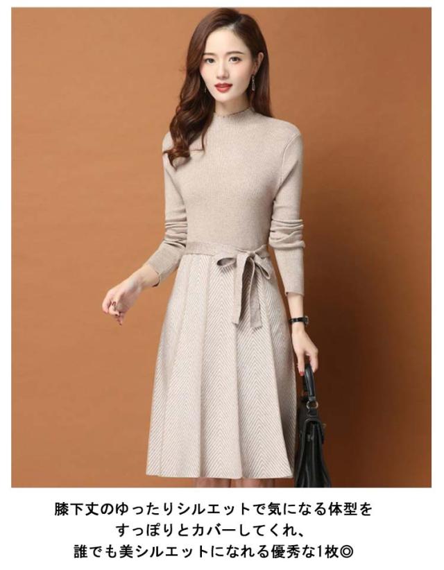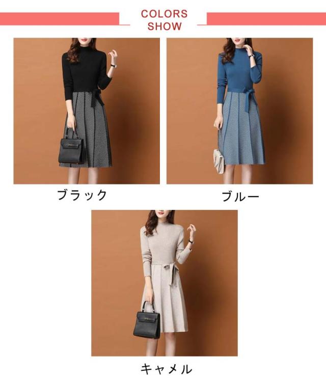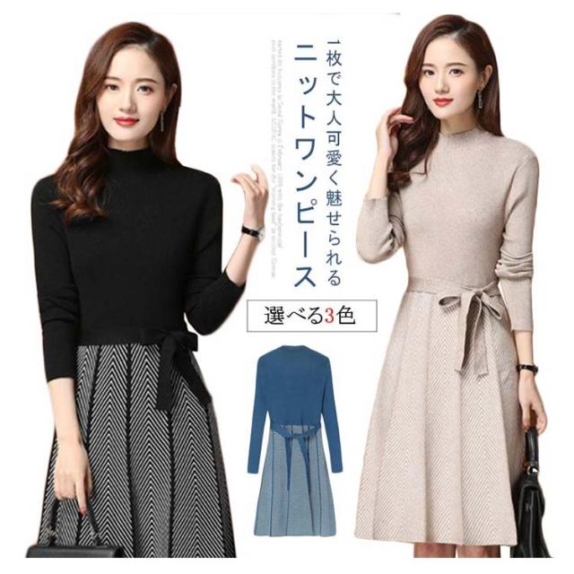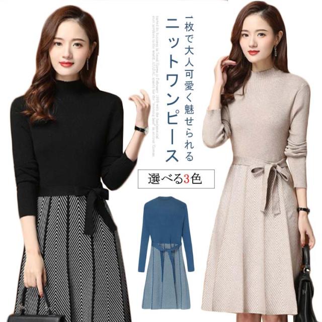 着痩せ レディース きれいめ ニットワンピース 膝丈 長袖 ロング 膝丈ワンピース ハイネック リボン 秋冬 ニットワンピース 暖かい 大きいサイズ Aライン 大人女性 オシャレ プリーツスカート 通勤 結婚式 OL 大人女性 30代 40代 50代 ギフト プレゼント