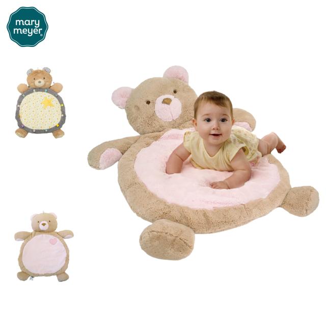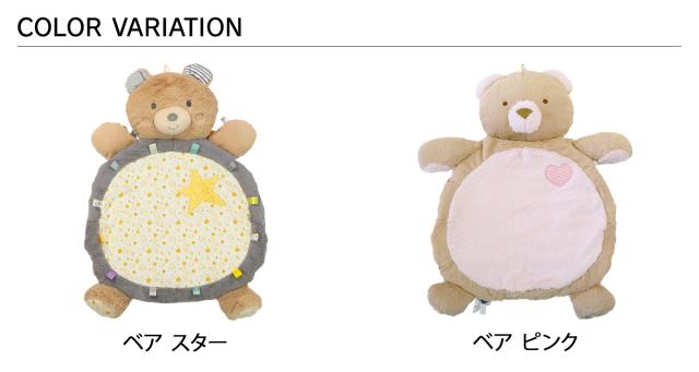 たくさんのタグが付いた「タギーズシリーズ」より可愛いベアのマットが登場しました。 マットには星がたくさん描かれています。 クマのお顔は枕代わりとして、寝転ぶお子様の頭を支えます。 ソフトでふわふわな肌触りとなっております。 「タギーズ」は、自分の赤ちゃんが洋服のタグに興味津々な姿を見たアメリカ人の母親のアイデアによって誕生しました。 リボンやタグを握ったりおしゃぶりしたりすることで、赤ちゃんの情緒安定の手助けをします。 タグのツルツルした触覚やカラフルな色合いが視覚を刺激します。