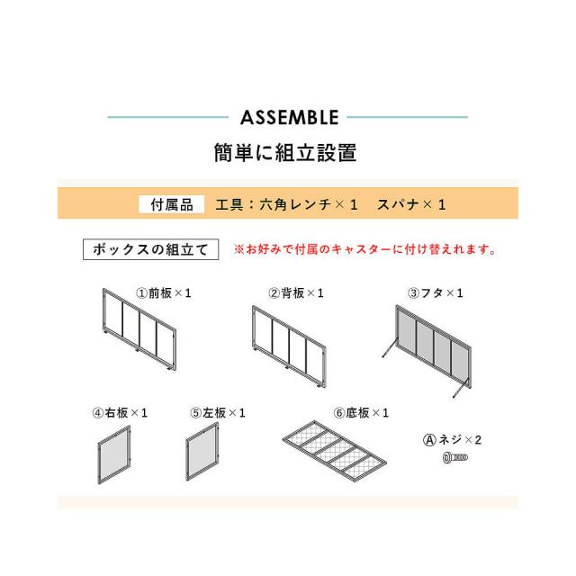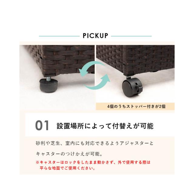 設置場所によってキャスターとアジャスターの付け替えが可能なので、室外・室内と選ばずにお使いいただけます。