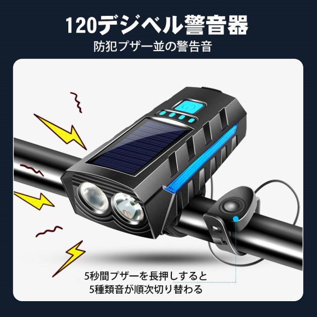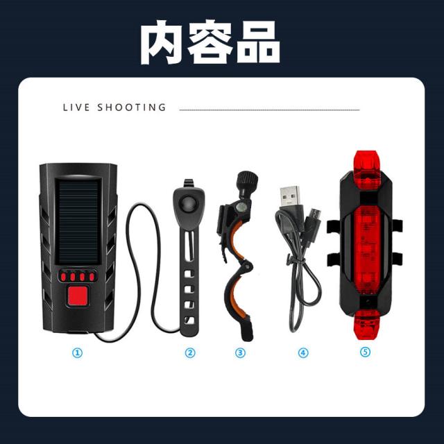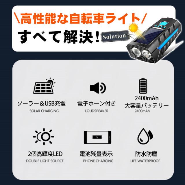 \即納/自転車 ライト 自転車ライト ソーラー充電 ベル テールライト付き LED 高輝度 小型 USB充電式 明るい IPX7防水 後付