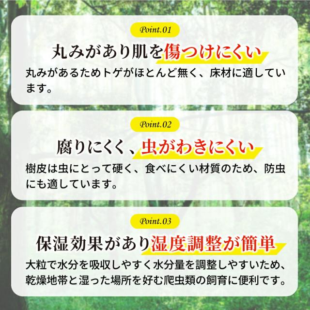 ■商品名:バークチップ【4L】 ■説明:・虫のわきにくい松の樹皮のマット。 ・脱臭力にも優れています。 ・飛び散りにくく使いやすいサイズ感。 ・爬虫類や昆虫飼育の床材として。