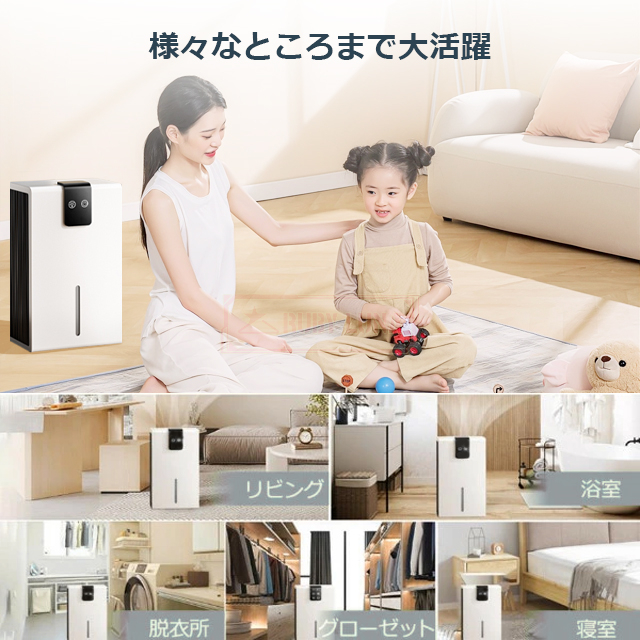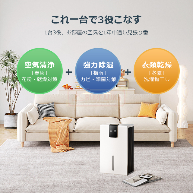 | 【一台3役 オールシーズン適用】 | ◆除湿・干衣・空気清浄の3役をこの1台で果たす除加湿空気清浄機です。さらに除湿機能を利用した衣類乾燥や部屋干しにも。一人暮らしにぴったり、複数の部屋での使いまわしも簡単に持ち運べるので、湿気の多いこれからの時期には欠かせない除湿アイテムです。 |