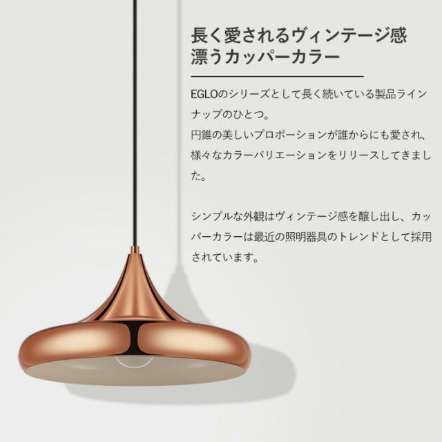 EGLOのシリーズのひとつとして長く続いている製品ラインナップのひとつです。円錐の美しいプロポーションが万人受けし、さまざまなカラーバリエーションをリリースしてきました。シンプルな外観はヴィンテージ感をかもしだし、カッパーカラーは最近の照明器具のトレンドとして採用されています。