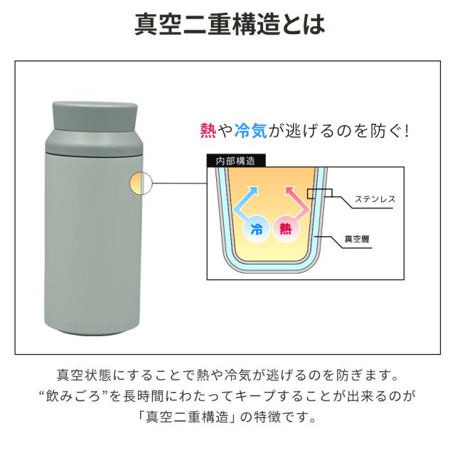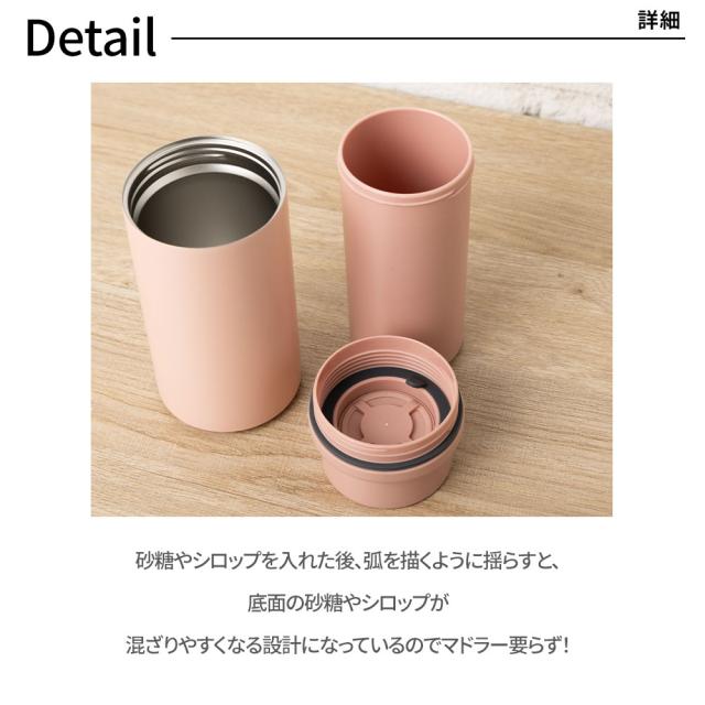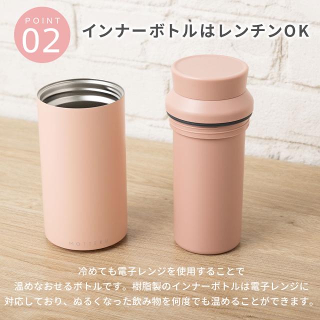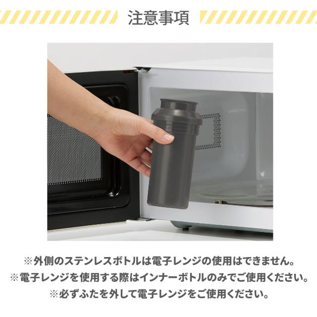 【冷めても電子レンジを使用することで温めなおせるボトル】をコンセプトにしたサーモボトルです。 樹脂製のインナーボトルは電子レンジに対応しており、ぬるくなった飲み物を何度でも温めることができます。 砂糖やシロップを入れた後、弧を描くように揺らすと、底面の砂糖やシロップが混ざりやすくなる設計になっているのでマドラー要らず! 外側のステンレス部分は2層の真空状態になっていて、長時間保冷・保温効果も十分あるので、大容量で飲みたい場合はインナーボトルを外してサーモボトルとしてお使い頂けます。 |