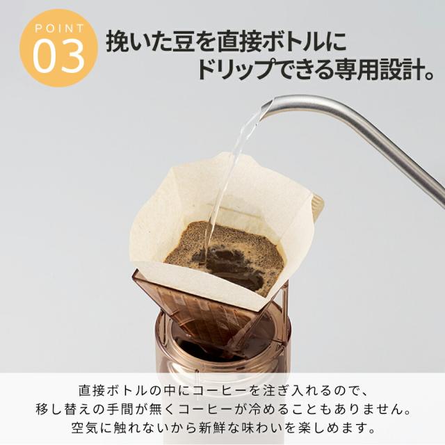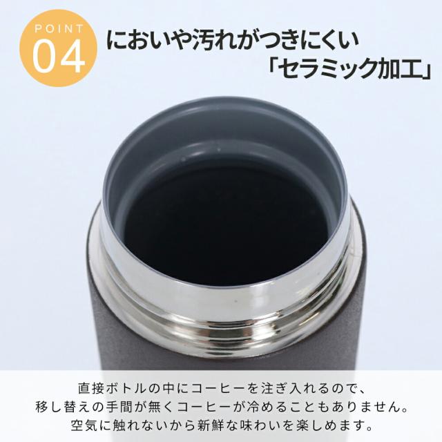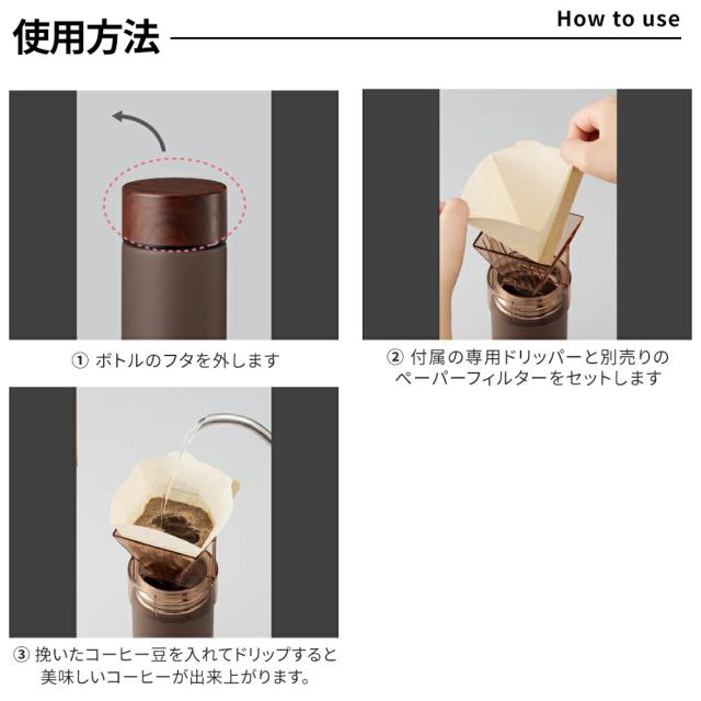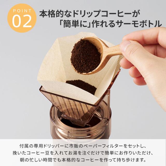 付属の専用ドリッパーに市販のペーパーフィルターをセットし、挽いたコーヒー豆を入れてお湯を注ぐだけで本格的なドリップコーヒーが「すぐに」「カンタンに」作れるサーモボトルです。 直接ボトルの中にコーヒーを注ぎ入れるので、移し替えの手間が無くコーヒーが冷めることもありません。 朝の忙しい時間でも本格的なコーヒーを作って持ち歩けるボトルです。 ボトルの内側にはセラミック加工が施されているので、長時間の持ち歩きでも においや汚れが付きにくいだけではなく、コーヒーに金属臭が移ることを防ぎます。 また、サーモ(保温冷)機能付きなので、暖かいコーヒーを長時間楽しむことができます。 付属の専用ドリッパーは、ボトルにしっかりと固定ができるように飲み口とピッタリのサイズで設計されております。 ご使用の際はドリッパーがボトルにしっかりはまっていることを確認し、熱湯を注いでください。 ドリッパーがしっかりとはまっていないと、熱湯を注ぐ際にドリッパーがズレたり外れたりしてヤケドをする恐れがございますのでご注意ください。 |