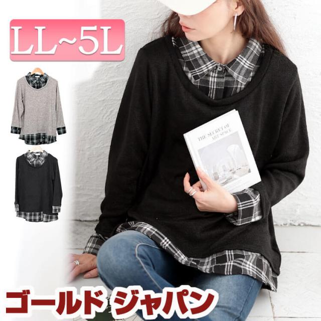 春新作 大きいサイズ レディース トップス シャツ ブラウス チェックシャツフェイクレイヤードプルオーバー 長袖 フェイクレイヤード 重ね着風 長袖 チェック 柄 襟 ボタン ラウンドカット ストレッチ 冬服 春服 秋服 LL 2L 3L 4L 5L ブラック 黒 グレー ゴールドジャパン