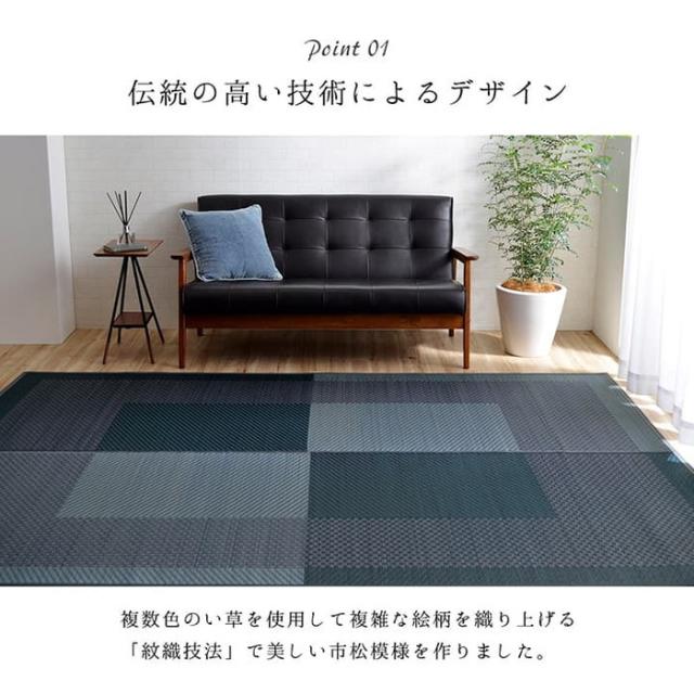 シンプルでモダンな市松柄のい草カーペットです。国産(九州産)のい草を使用しています。一本一本が太く、表皮が厚く繊維がキメ細かいので弾力性があり、耐久性に優れています。い草には空気の自然浄化作用、湿度の調節作用などがあります。い草に青森ヒバ加工を施しています。(抗菌、防臭効果)洗濯表示:洗えません。