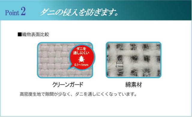 生地にマイガードを使用しています。マイガードは繊維と繊維の隙間が少ない高密度生地なので、ほこりの原因となる糸切れ、毛羽立ち、中綿の吹き出しを防ぎハウスダストを大幅に低減します。またダニの侵入を防ぎクリーンで快適な睡眠をサポートします。洗濯表示:30℃以下の水温で洗濯機の弱水流もしくは弱い手洗いができます。(洗濯時は洗濯ネットをご使用ください。) 干し方=日陰のつり干しがよい。適応サイズ:シングル